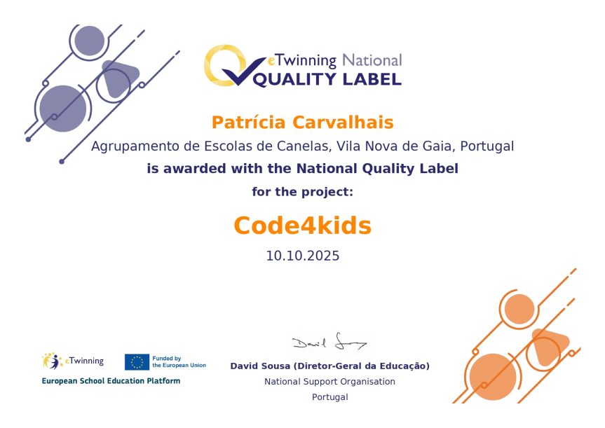 É com grande satisfação que anunciamos que o projeto “Code4Kids”, a nossa principal iniciativa do clube no último ano letivo, foi oficialmente distinguido com o Selo Nacional de Qualidade eTwinning.